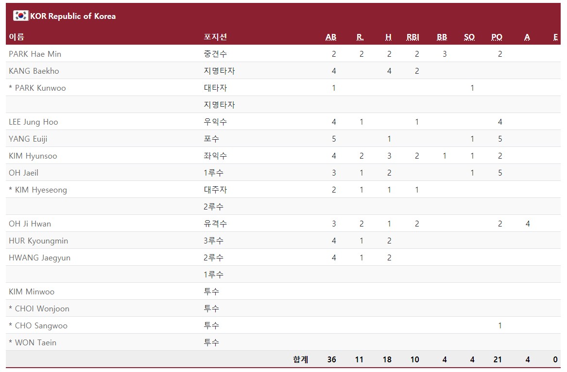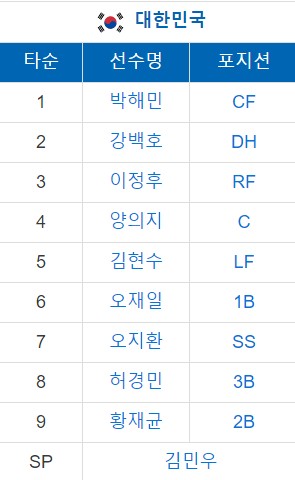 박해민(중견수)-강백호(지명타자)-이정후(우익수)-양의지(포수)-김현수(좌익수)-오재일(1루수)-오지환(유격수)-허경민(3루수)-황재균(2루수)이 선발 출장한다. 전날 도미니카 공화국전과 똑같다.