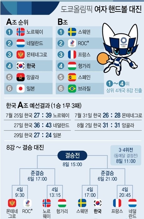여자 핸드볼은 8강전을 스웨덴과 한다. 8월 4일 오후 5시에 한다.