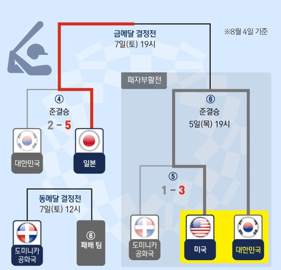 미국에 진다면 동메달 결정전 도미니카 전 8월 7일 낮 12시이다.