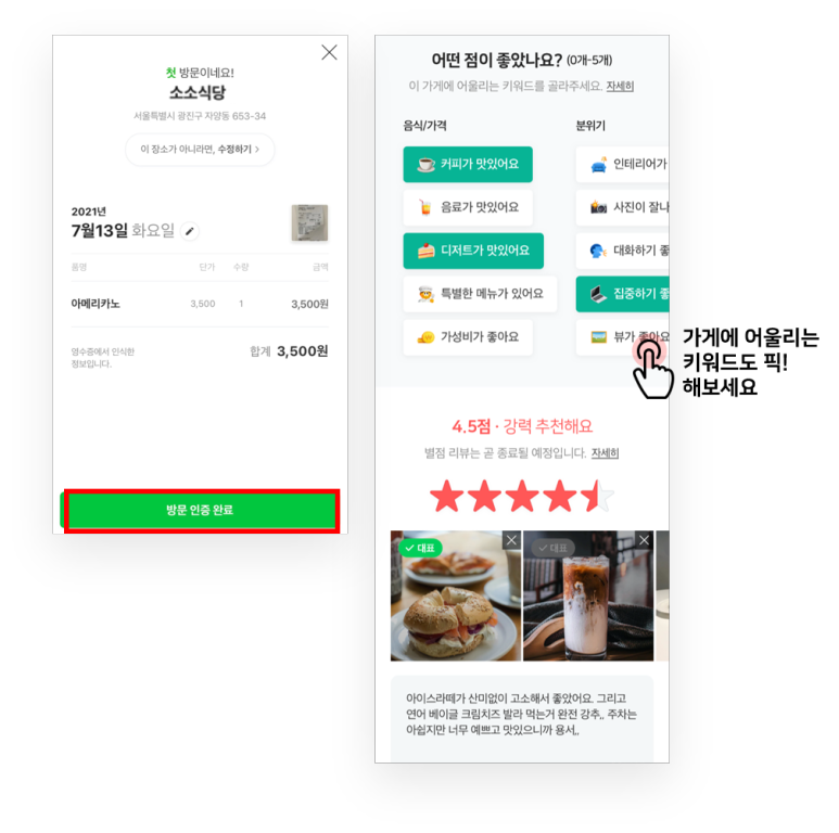 4. 영수증 내역을 확인하고 맞으면 '방문 인증 완료' 버튼을 누른다. 가게에 대한 리뷰를 할 수도 있다.