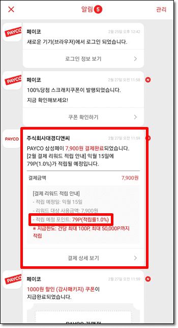 삼성페이 × 페이코로 결제 시 페이코로 이런 알림 문자가 오고 적립 예정 포인트를 알려준다.