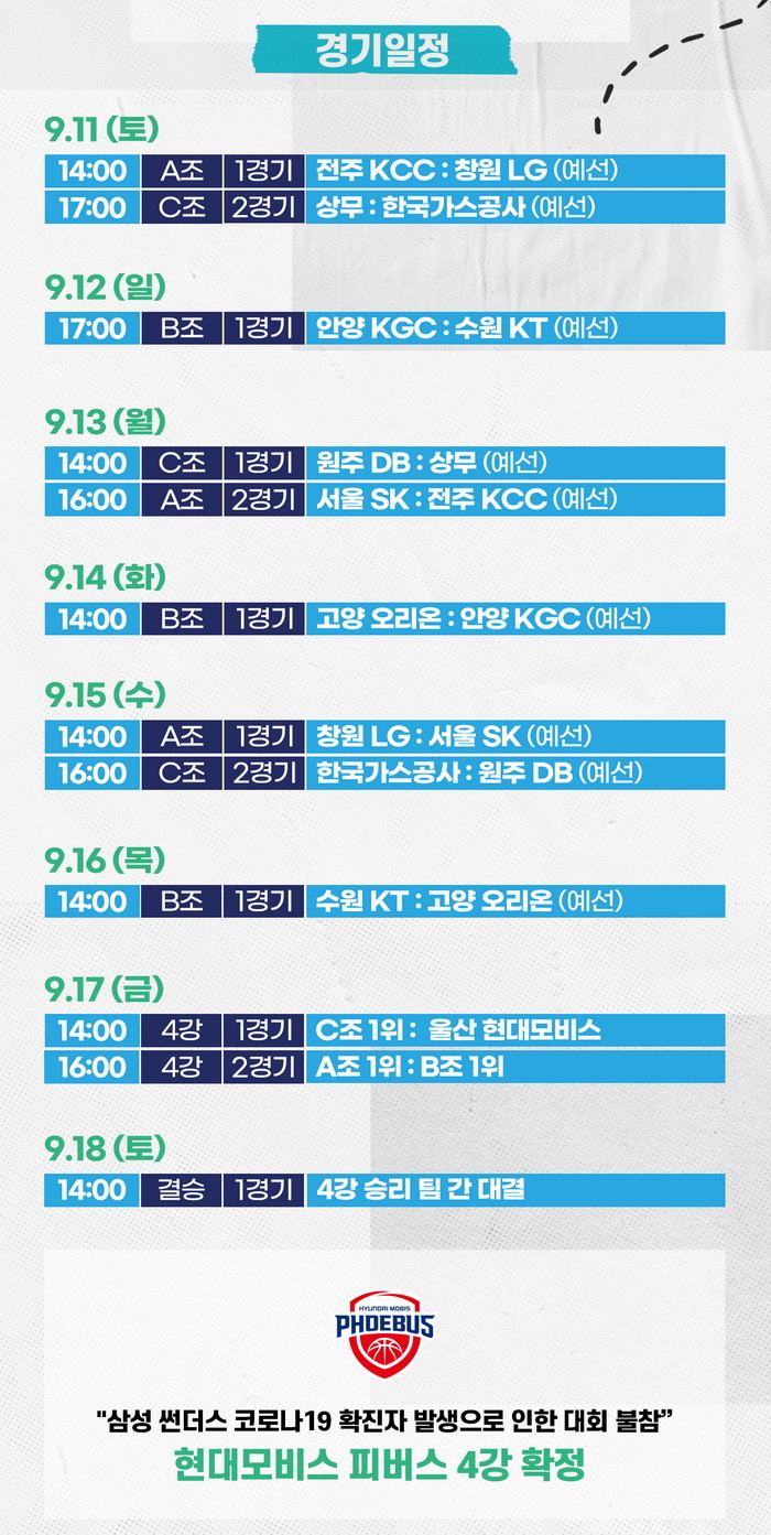 하지만 삼성의 코로나 확진으로 대회 일부가 취소되었다. 삼성의 코로나 확진으로 인해 컵대회 참가가 불가능 해졌고 이에 같은 조에 있던 모비스는 경기도 안 하고 4강행이 확정됐다.