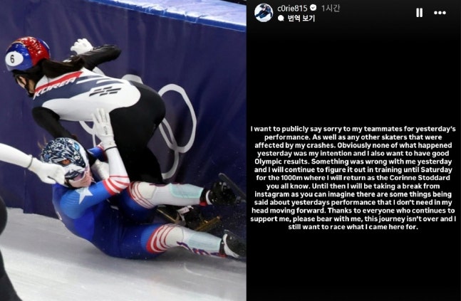 2026 밀라노·코르티나담페초 동계올림픽 쇼트트랙 혼성계주 준결승에서 김길리를 넘어뜨린 미국 선수가 "나로 인해 영향을 받은 다른 선수에게 사과한다"고 했다.