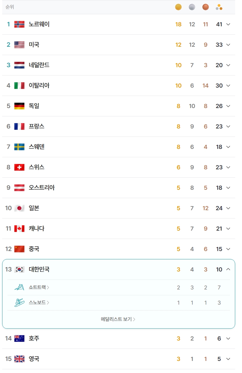 | [D+15] 동계올림픽 대한민국 선수단 경기 결과 및 이모저모 (0) | 2026.02.22 |