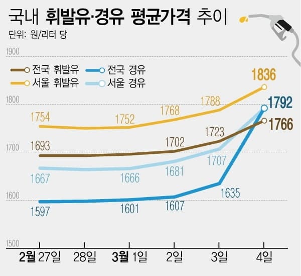 This marks the first time in about three years and seven months that the nationwide average gasoline price has exceeded 1,800 won per liter.