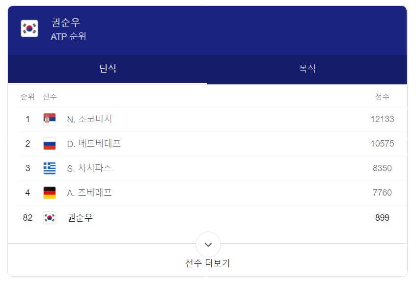 이번 대회전까지 권순우는 82위였지만 이번 우승으로 랭킹 포인트도 250점을 쌓았다. 역대 최고였던 69위 랭킹을 50위권까지 단숨에 끌어올릴 전망이다.