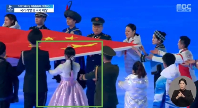 중국 사회 각계 대표, 훈장 또는 명예 칭호 수여자, 56개 민족 대표 등이 참여한 ‘소시민들의 국기 전달’이라는 단계에서 한복으로 보이는 의복이 잡힌 것이다. 흰색 저고리에 분홍색 치마를 입고 댕기머리를 한 모습이었다.