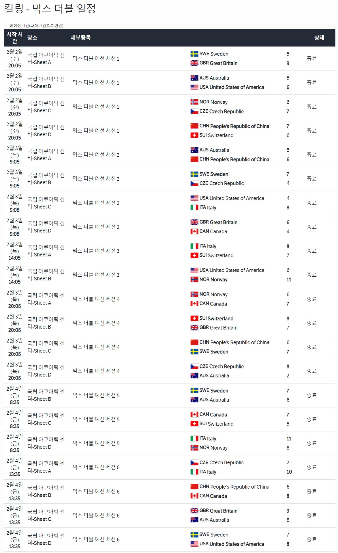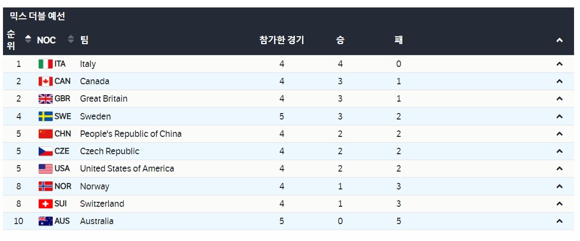 오늘이 개막이었지만 컬링은 이미 시작을 했다. 컬링 종목 중 믹스 더블 경기가 이미 상당 경기가 치러졌다. 이탈리아가 1위를 달리고 있다.