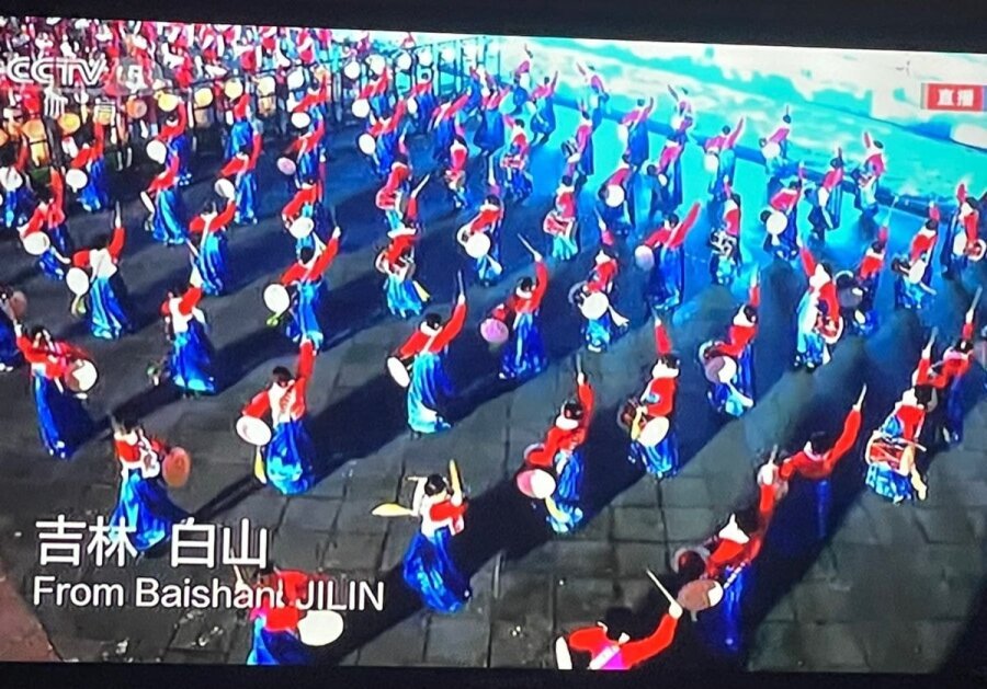 중국 관영매체 CCTV 방송화면에는 상모를 돌리고 단체로 장구를 연주하는 모습이 나왔다는 지적도 있다. 이 모습은 중국 내에서만 방영된 것으로 보인다.