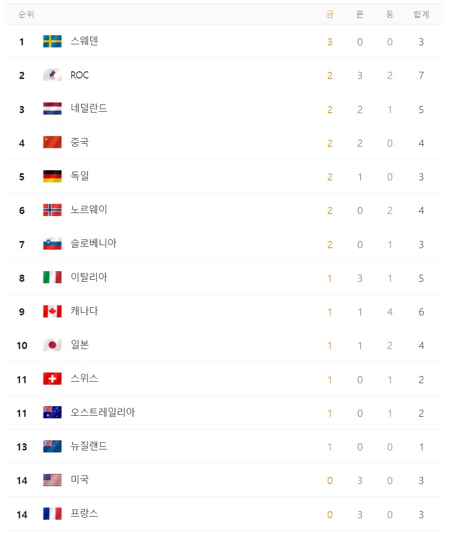 4. 2022 베이징 동계 올림픽 현재 메달 순위 (2월 7일 24시 기준)