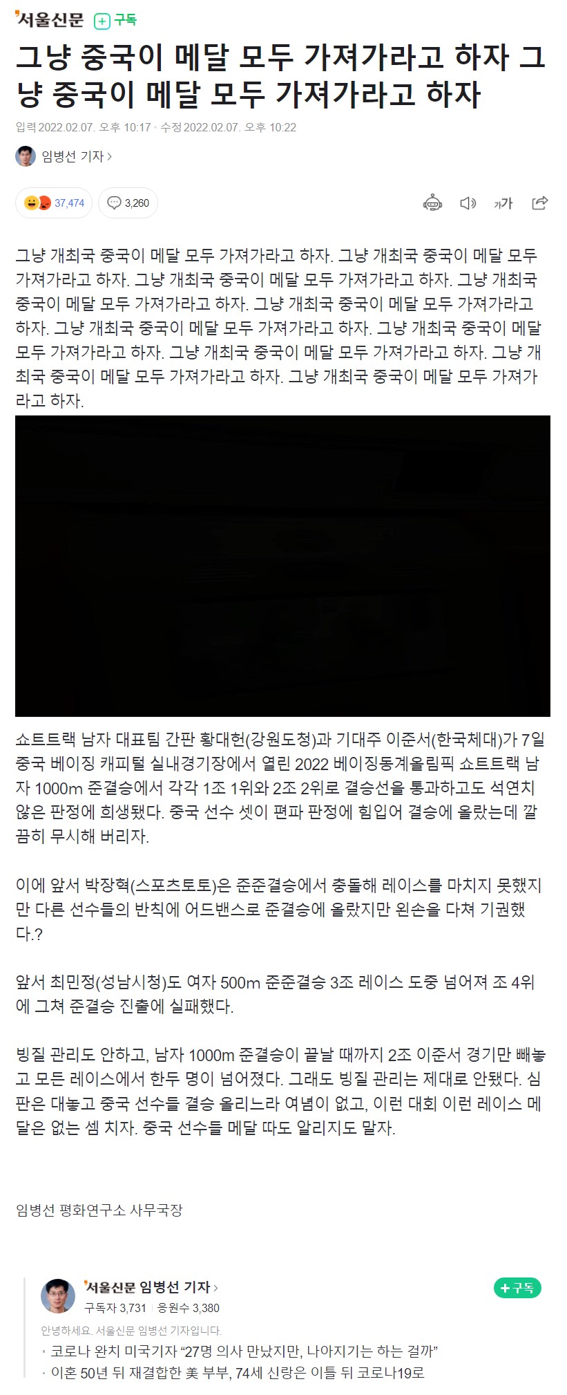 중국의 편파판정에 임병선 기자는 분노가 가득 담긴 기사를 썼다. 지금은 삭제된 상태이다.