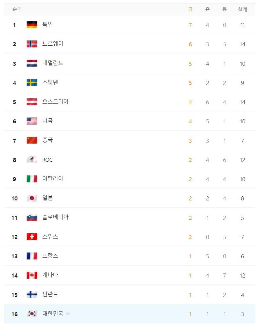 4. 2022 베이징 동계 올림픽 현재 메달 순위 (2월 11일 24시 기준)