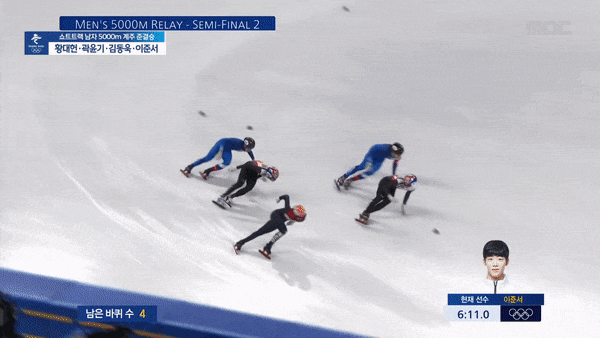 황대헌, 이준서, 곽윤기, 김동욱으로 조를 이룬 남자 대표팀은 쇼트트랙 남자 5,000m 준결승 2조에서 6분 37초 879의 기록으로 1위를 차지해 파이널 A(결승) 티켓을 획득했다.
