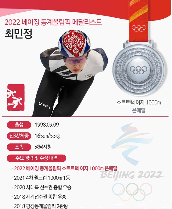 쇼트트랙 여자 국가대표팀 최민정이 2022 베이징 동계올림픽 여자 1,000m 결승에서 자랑스러운 은메달을 따냈다.