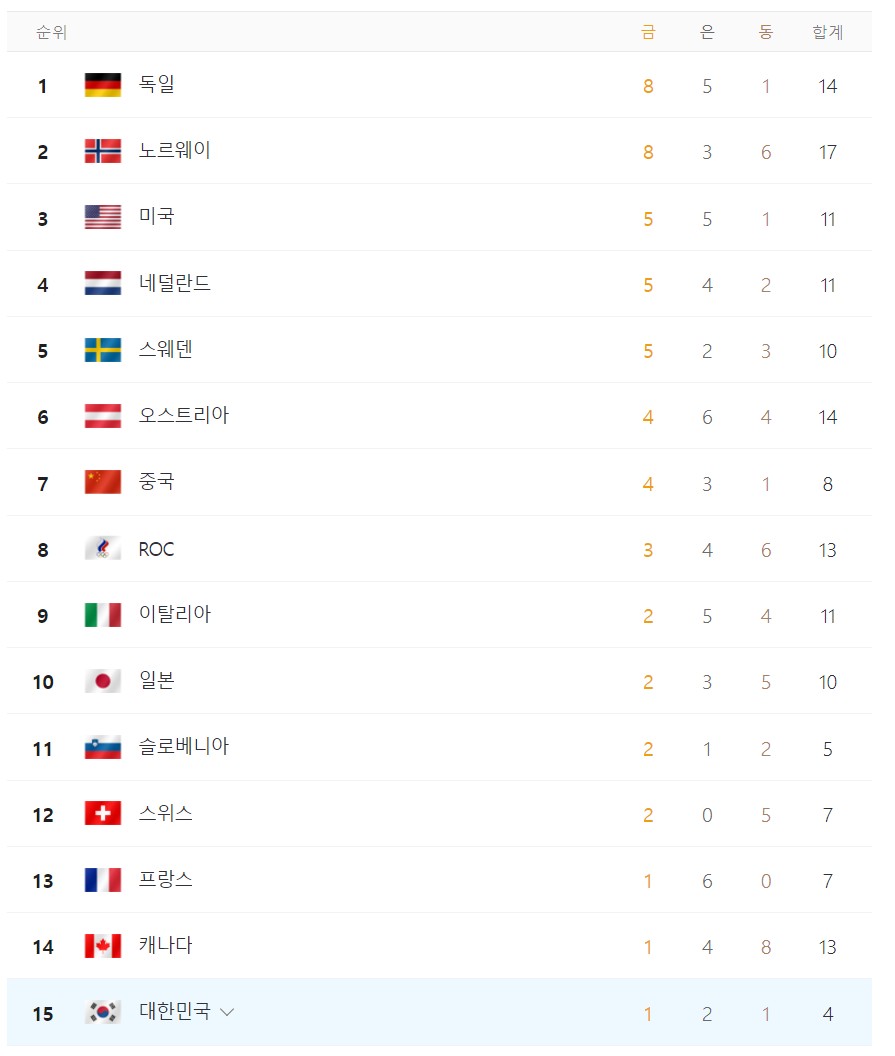 4. 2022 베이징 동계 올림픽 현재 메달 순위 (2월 12일 24시 기준)