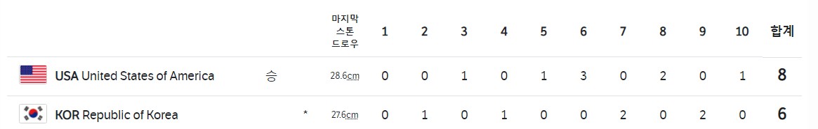 6 엔드에서 김은정의 실수로 3점을 스틸 당하면서 사실상 경기는 끝났다. 그다음은 한국이 추격하면 미국이 다시 달아나는 양상이 반복됐다. 7 엔드 4-5로 바짝 추격했으나, 8 엔드에서 미국이 다시 2점을 달아났다. 한국이 9 엔드에서 또 2점을 따냈지만 마지막 10 엔드에서 1점을 내주며 경기에서 졌다.