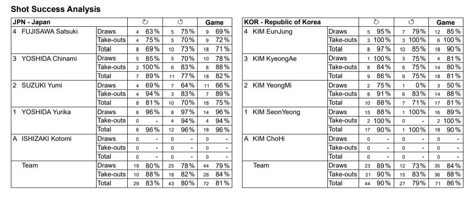김은정의 6개의 테이크 아웃 샷이 모두 성공하면서 100%를 기록했다. 후지사와는 실수를 연발하면서 스틸을 3번이나 내주면서 무너졌다.