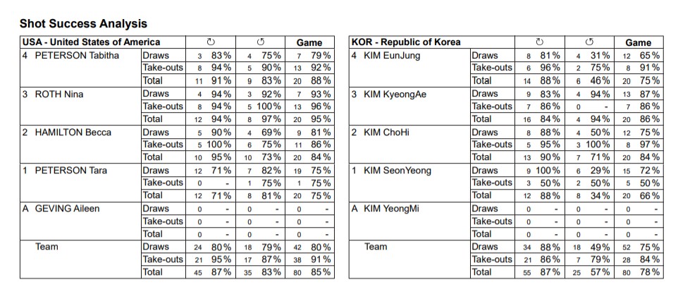 분석표를 보면 스킵 김은정의 드로우 샷 성공률이 낮았다. 또한 김선영의 테이크 아웃 성공률도 50%로 저조했다.