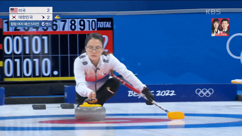 팀 킴은 여자 컬링 예선 5차전에서 미국에 6대 8로 패했다.