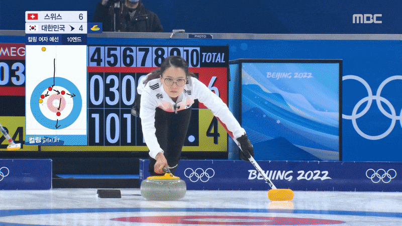오늘 연승을 통해 4강 진출의 불씨를 이어가려던 여자 컬링 국가대표 '팀 킴'이 스위에 패하면서 3승 4패를 기록, 전체 7위로 떨어졌다.