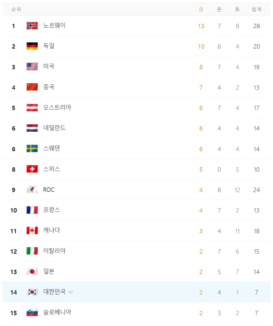 4. 2022 베이징 동계 올림픽 현재 메달 순위 (2월 16일 24시 기준)