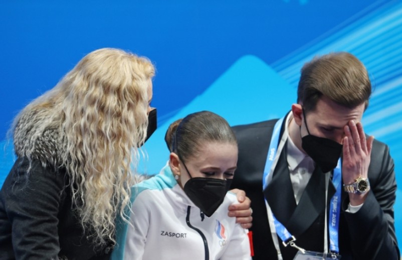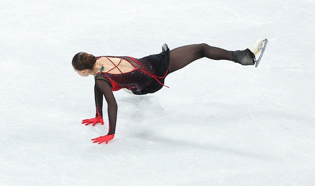 약물 파문에 휩싸인 카밀라 발리 예바 러시아 선수가 '엉덩방아 2번' 등 최악의 연기로 4위로 추락했다.
