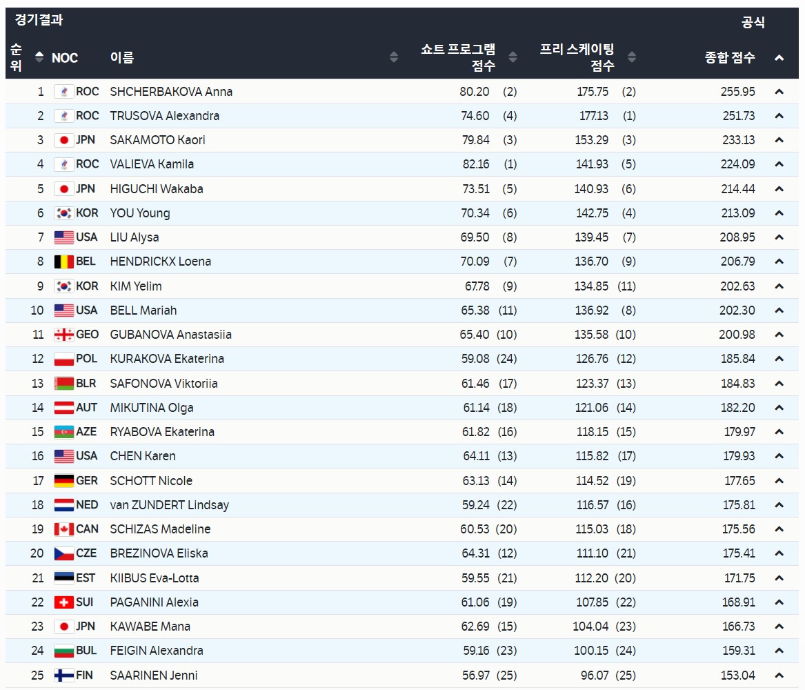 금메달은 러시아올림픽위원회의 안나 쉐르바코바가 차지했다. 쉐르바코바는 프리스케이팅에서 175.75점을 획득, 쇼트 합계 255.95점으로 가장 높은 점수를 획득했다. 2위는 러시아올림픽위원회의 알렉산드라 트루소바(251.73점), 그리고 3위는 일본의 사카모토 가오리(233.13점)에게 돌아갔다.