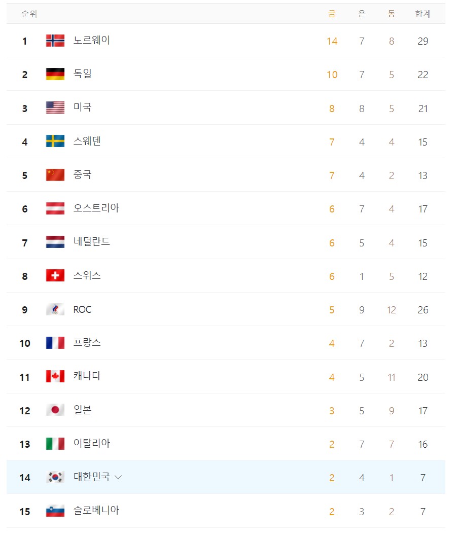 4. 2022 베이징 동계 올림픽 현재 메달 순위 (2월 17일 24시 기준)